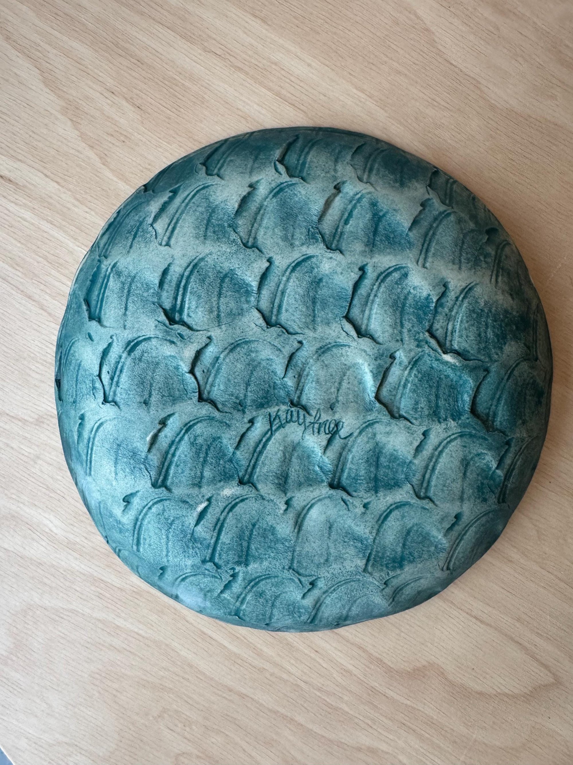 Bring coastal charm to your table with this 6-inch handmade ceramic plate, featuring a shell stamp wave design in sea green. The matte exterior contrasts beautifully with the glossy interior, creating a natural ocean-inspired look. Perfect for desserts, appetizers, or display, each plate is hand-built, hand-glazed, and completely unique. Food, microwave, and dishwasher safe.